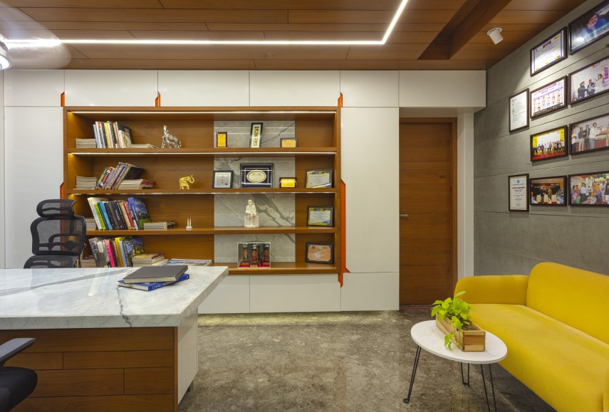 Interarch Associates, a design studio with some key elements as water body, existing tamarind tree, natural material and right light ensuring we are connected with nature. Existing Tamarind tree welcomes one with its presence and changes the ambience according to the seasons. Our studio is designed with a vision that its simplicity and minimalism blends with nature, which creates energetic and enchanting workspace. Use of natural stone, wood and concrete walls have kept the office design minimal, simple and in contrast with natural landscape.
